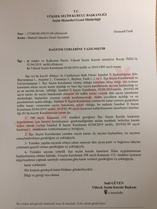 - CHP'nin bu kararlara karşı yaptığı itirazı değerlendiren İstanbul İl Seçim Kurulu ise CHP'nin, ''yeniden oy sayımının tedbiren durdurulmasına'' ilişkin talebini kabul ederek, sayımın tedbiren durdurulmasına karar vermişti.