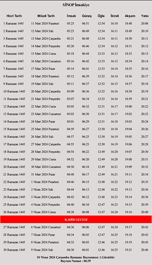 On bir ayın sultanı Ramazan-ı Şerif’in manevi iklimine girdik. 2024 Ramazan ayının birinci günü 11 Mart 2024 Pazartesi gününe denk geldi. İlk teravih 10 Mart akşamı yatsı namazıyla birlikte kılındı. O gece de ilk sahura kalkıldı. Diyanet İşleri Başkanlığı 2024 Ramazan imsakiyesini yayımladı. İşte Sinop Ramazan imsakiyesi 2024 imsak, sahur, iftar, akşam ezan saatleri.