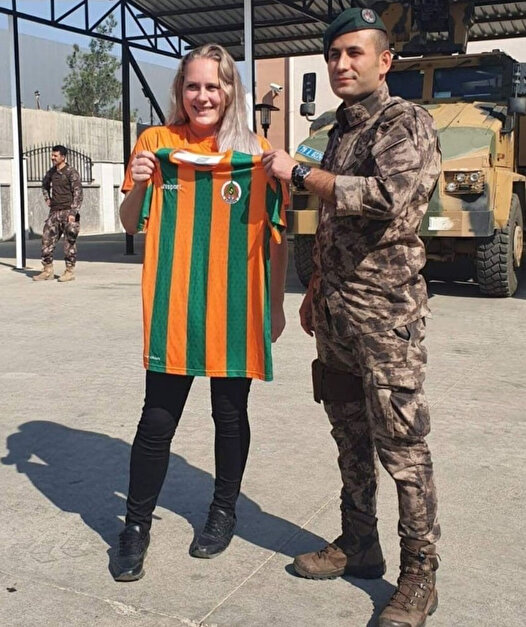 Öncüpınar Sınır Kapısı’nda görev yapan özel harekat polisleri ile sohbet eden Yörükler Grubu adına, grup lideri Hilmi Güney ve Norveçli taraftar Charlotte Erga, şube amirine Alanyaspor forması hediye etti.