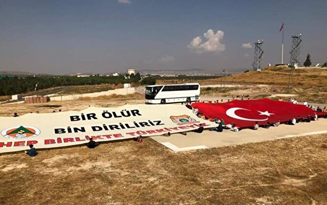 Kilis PÖH Şube Müdürlüğü’nü ziyaret eden Şimşekler Grubu lideri Fatih Aslan ve üyeleri ise Suriye sınırında ’Bir ölür, bin diriliriz’ yazan pankart açarak, asker ve polisimize destek mesajı verdi.