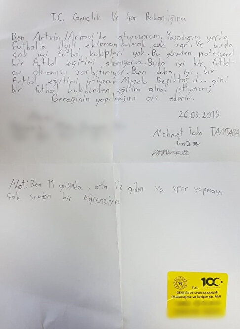Futbol sevgisi nedeniyle boş zamanlarının çoğunu okul bahçelerinde ve sokak aralarında beton zeminde futbol oynayarak geçiren, 11 yaşındaki Mehmet Taha Tamtabak, futbol eğitimi alarak daha uygun koşulda futbol oynayabilmek için Gençlik ve Spor Bakanı Mehmet Muharrem Kasapoğlu’na mektup yazdı.