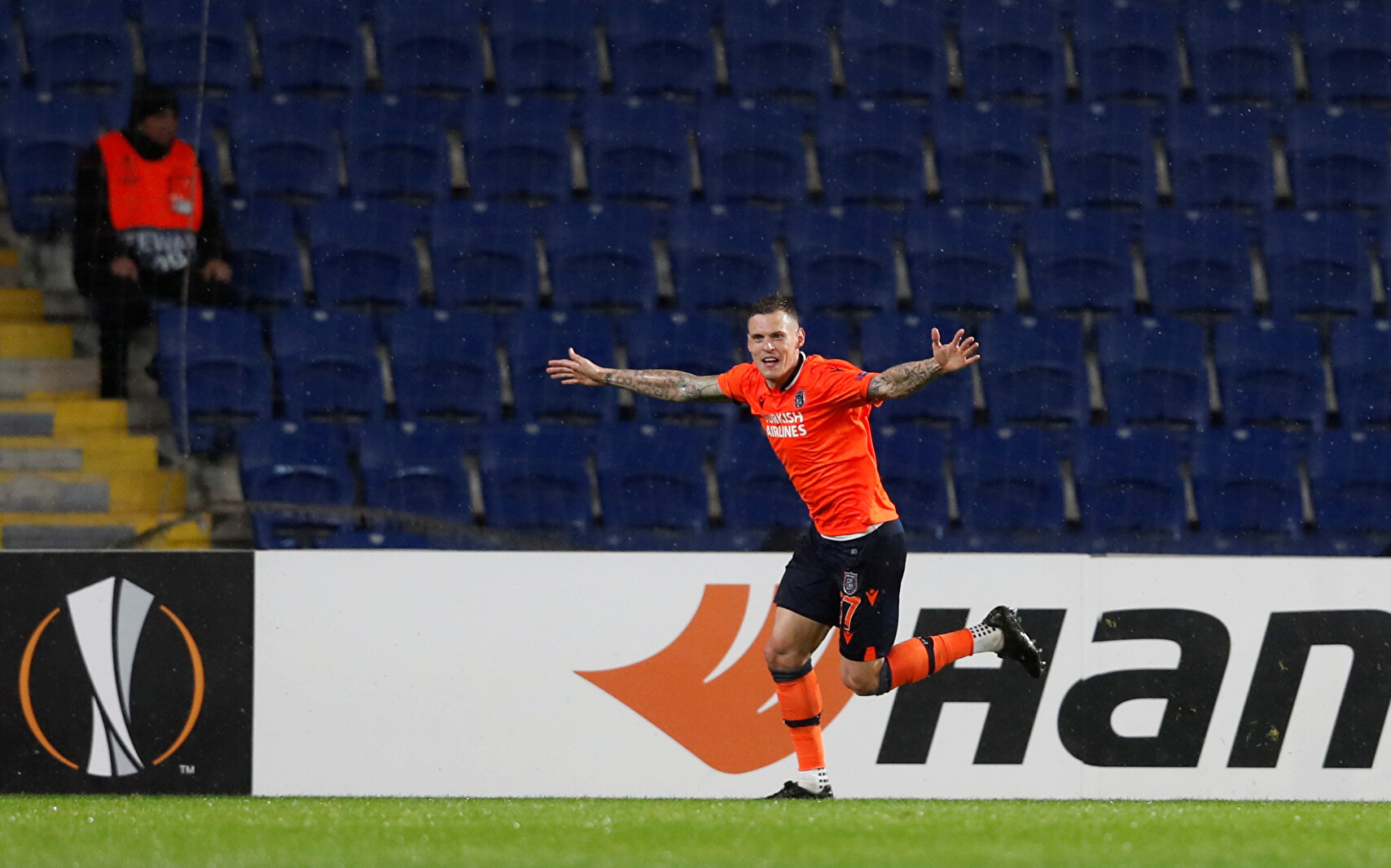 Medipol Başakşehirli teknik ekip ve futbolcular maçın bitiş düdüğüyle birlikte büyük sevinç yaşadı. Tribünleri dolduran taraftarlarla birlikte tur sevincini yaşayan turuncu-lacivertli ekibin sevinci saha içinde uzun süre devam etti.