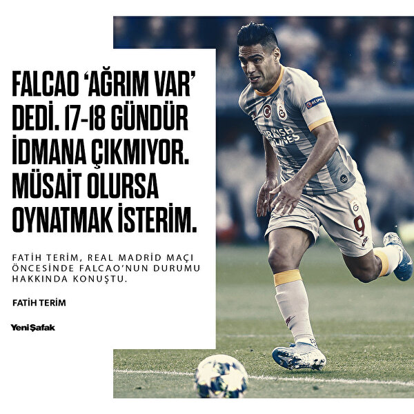 - "Falcao ağrım var dedi. Bugün konuştum. Baktığınızda 17-18 gündür oynamıyor. Antrenmana da çıkmıyor. Müsait olursa Falcao'yu Şampiyonlar Ligi maçında tabi ki oynatmak isterim. Ancak bu durumda nasıl oynatacağız bilemiyorum fakat uğraşacağız."