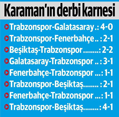 Bordo-mavili takım, geçen sezon başında göreve getirdiği Ünal Karaman yönetiminde Beşiktaş, Fenerbahçe ve Galatasaray karşısında oynadığı 8 lig maçında sadece 1 yenilgi aldı. Söz konusu karşılaşmaların 4’ünde galibiyetle ayrılan Karadeniz ekibi, 3 maçta da rakipleriyle berabere kaldı. Bordo-mavililer bu maçlarda attığı 17 gole karşılık kalesinde 10 gol gördü. Karaman yönetimindeki Trabzonspor, bu sonuçlarla ezeli rakipleri karşısında bugüne kadar 15 puan toplarken, 9 puan kaybetti. Trabzonspor, Karaman yönetiminde taraftarı önünde İstanbul’un 3 büyüklerine karşı oynadığı maçları kazandı.