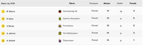 Ligde 10 golü bulunan Stancu'yu, dokuzar golle Adis Jahovic (BtcTurk Yeni Malatyaspor), Alexander Sörloth (Trabzonspor), Papiss Cisse (Aytemiz Alanyaspor) ve Vedat Muric (Fenerbahçe) takip ediyor.