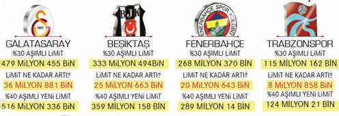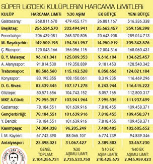 TFF yönetim kurulu, Pazartesi günü toplandı ve Kulüplerin Harcama Limitlerinin Hesaplanması bölümündede değişiklik yaparak 2019-2020 sezonu için kabul edilebilir sapma tutarını yüzde 30’dan yüzde 40’a yükseltti. 18 takımın hepsinin limiti yüzde 30 aştığını farzedersek, toplamda harcayabilecekleri rakam 2 milyar 735 milyon 533 bin liraya ulaşıyordu. Son limitle birlikte ise bu rakam 2 milyar 946 milyon TL’ye ulaştı. Bütçeleri denk getiremedikleri için puan silme ve küme düşme cezasıyla karşı karşıya olan kulüplerin talebini kabul eden TFF’nin kararı, tepkilere neden oldu. Yüzde 10’luk artış sayesinde Galatasaray 36.8, Beşiktaş 25.6, Fenerbahçe 20.6, Trabzonspor ise 8.8 milyon TL daha fazla harcayabilecek.