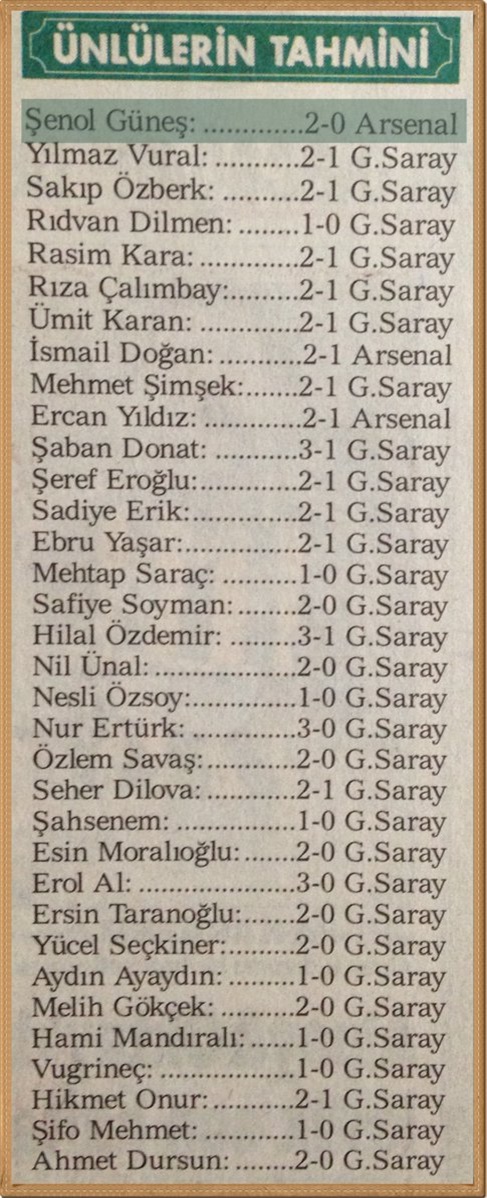 Bunların en dikkat çekici olanı ise 'Futbol Arşiv' adlı sosyal medya hesabının paylaştığı ünlülerin Galatasara-Arsenal maçı tahminleri oldu. O paylaşıma göre Galatasaray'ın 17 Mayıs zaferi öncesinde şu an Beşiktaş Teknik Direktörü olan Şenol Güneş, '2-0 Arsenal kazanır' diyor.