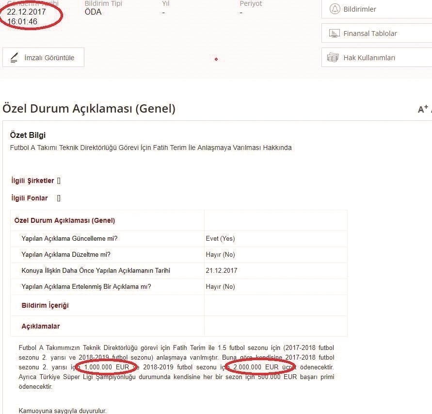 Yani madde, Fatih Terim'in 15 Kasım 2018'e kadar herhangi bir kulüple sözleşme imzalaması durumunda federasyonun tazminatın bir kısmından kurtulduğu anlamına geliyor. Bu durumda Terim, hukuki olarak Ağustos 2017 ile Aralık 2017 arasında işsiz olduğu için TFF'den 5 aylık maaşını talep edebiliyor. Bu da 1 milyon 455 bin Euro'ya tekabül ediyor. Terim, ayrılığın ardından “Ben hayatımda hiç tazminat almadım” dese de TFF'ye karşı 12 milyon 950 bin TL'lik tazminat davası açtı. Federasyon tarafı, Alaçatı'da yaşanan kavgada Terim'in, TFF yetkilisi Selahattin Aydoğdu'ya fiili hareketi nedeniyle bu 5 aylık tazminatın da ödenmemesi gerektiği gerekçesiyle davaya itiraz etti. Fatih Terim, geçtiğimiz hafta Galatasaray'la 1.5 yıllık sözleşme imzalarken, alacağı bedel Kamuyu Aydınlatma Platformu'na ilk önce 2017-2018 sezonu için 1 milyon Euro, 2018-2019 sezonu için 2 milyon Euro olarak açıklandı. Ardından yeni bir bildirim yayınlayan Galatasaray, Terim'e ödenecek ücretin bu sezonun ikinci yarısı için aylık 1905 TL, 2018-2019 sezonu için 3 milyon Euro olacağını açıkladı.
