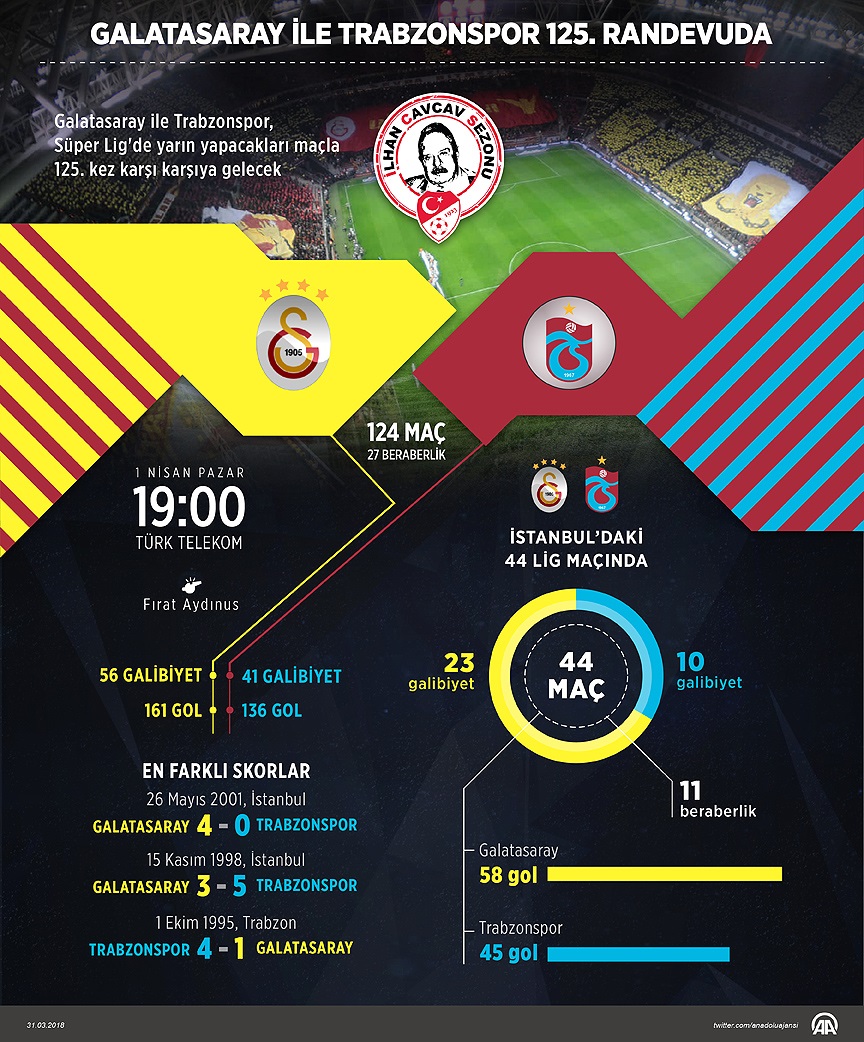 Galatasaray, Trabzonspor ile ligde 125. kez karşı karşıya gelecek. iki takım bugüne kadar lig, kupa ve özel müsabakalar toplamında 124 kez karşı karşıya geldi. Söz konusu karşılaşmalarda 56 kez sarı-kırmızılılar sahadan galip ayrılırken, 41 kez de bordo-mavililer rakibini mağlup etti. 27 karşılaşmada ise taraflar birbirlerine üstünlük sağlayamadı.