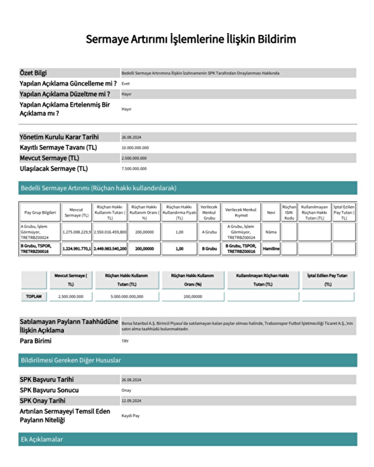 Bordo-mavililerin bedelli sermaye artırımı Sermaye Piyasası Kurulu (SPK) tarafından onaylandı. Karadeniz ekibi, 2.5 milyar TL gelir elde etmeyi ve Bankalar Birliği'nden çıkmayı hedefliyor.