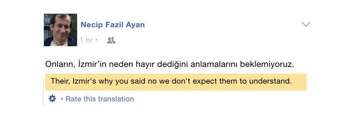 Bu öneriler makine öğrenmesinin yanında sistemi yöneten kişilerin yönlendirmesiyle de alakalı olabiliyor. Facebook tarafından yapay zeka çevirilerine ilişkin olarak yayınlanan bir makalede kullanılan aşağıdaki cümle gibi. Türkçe-İngilizce çeviri için kullanılan cümle seçimi oldukça dikkat çekici.