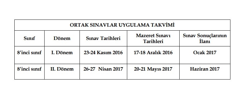 b. Ortak sınavlar, birinci günde tek oturumda üç ders sınavı (Türkçe, matematik, din kültürü ve ahlak bilgisi), ikinci günde yine tek oturumda üç ders sınavı (fen bilimleri, T.C. inkılap tarihi ve Atatürkçülük, yabancı dil) olmak üzere iki oturum hâlinde uygulanacaktır.