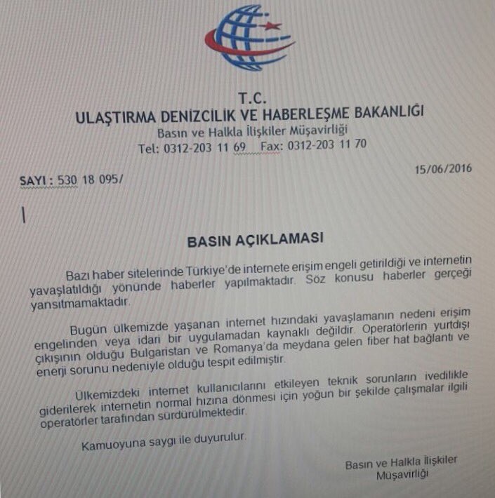 : "Internetteki yavaşlamanın Operatörlerin yurtdışındaki fiber hat ve enerji sorunu nedeniyle olduğu tespit edilmiştir.Yurtdışı internet çıkışlarımızın çeşitlendirilmesi ve her türlü fiziksel engelin iletişimi aksatmayacağı şekilde planlanması gerekmektedir." dedi.
