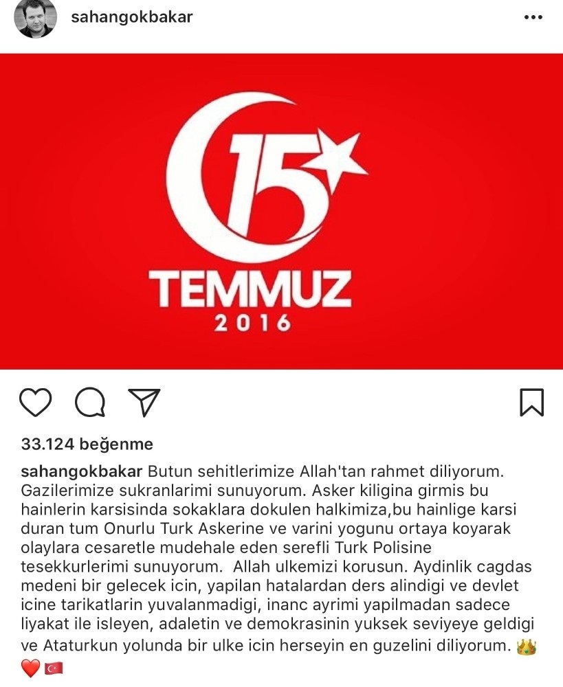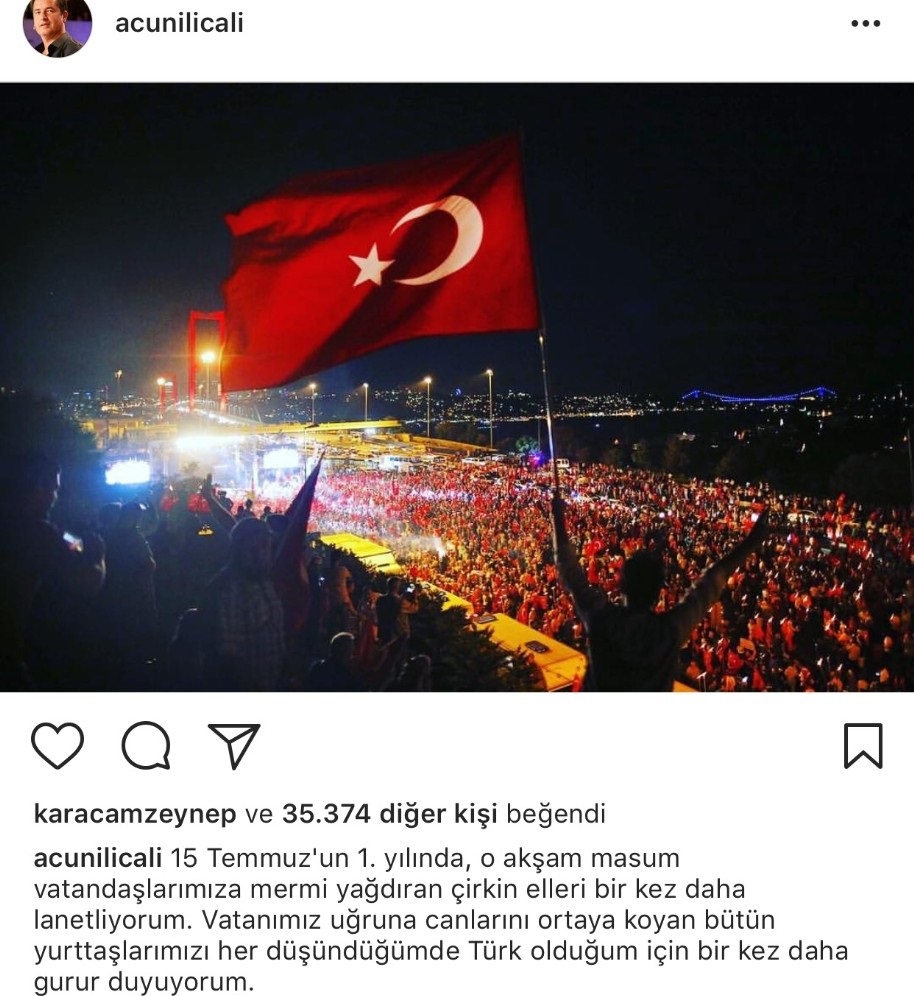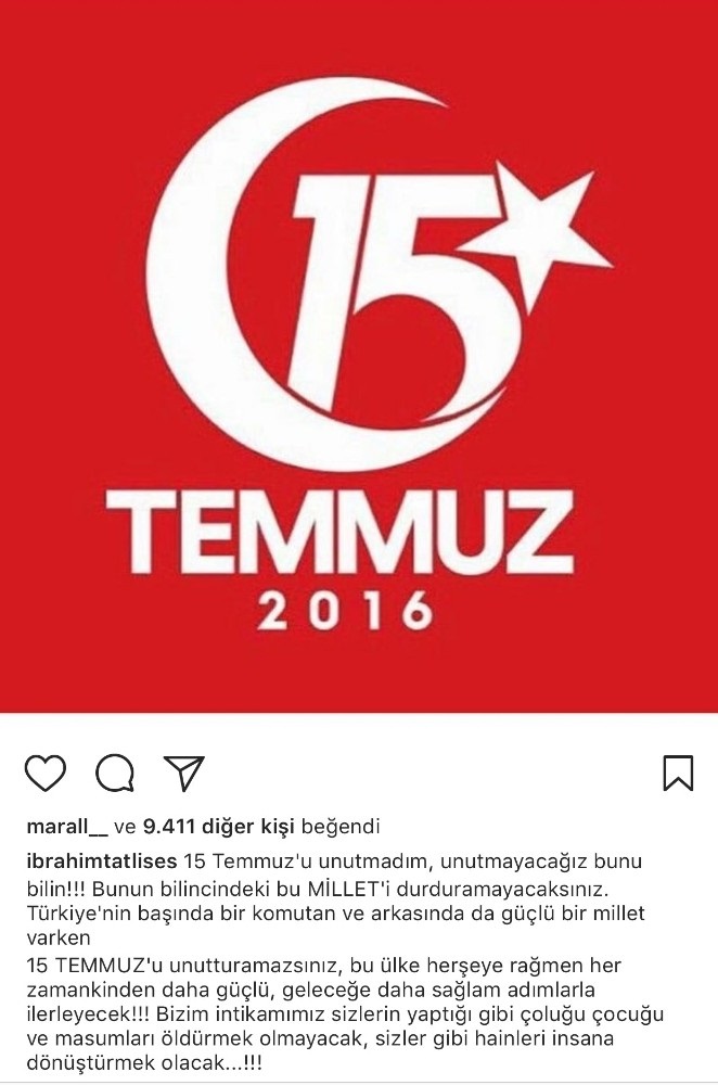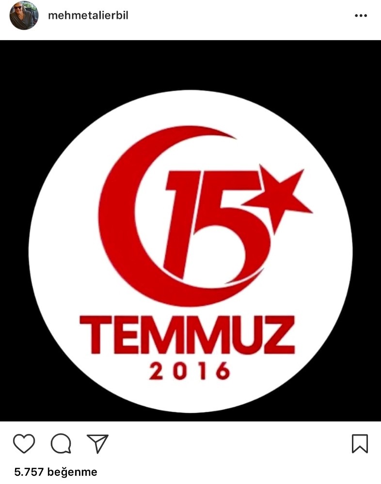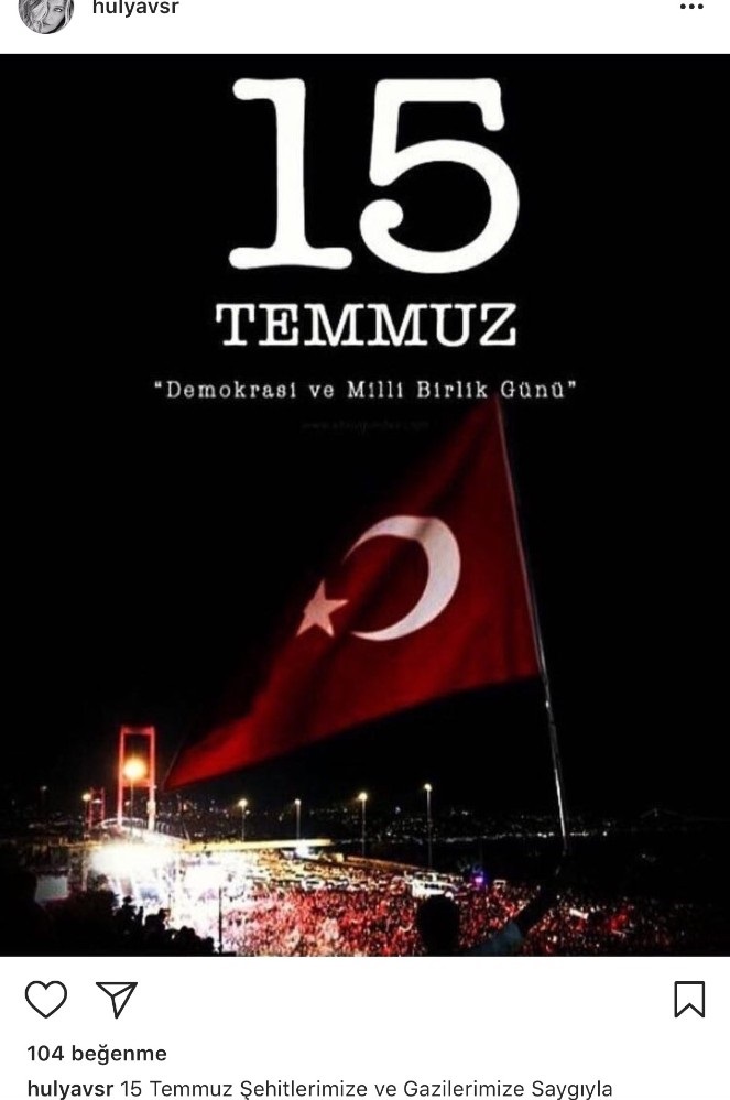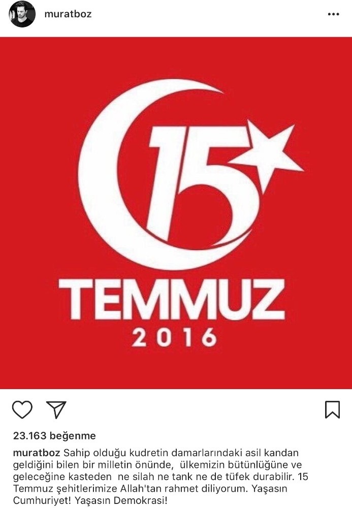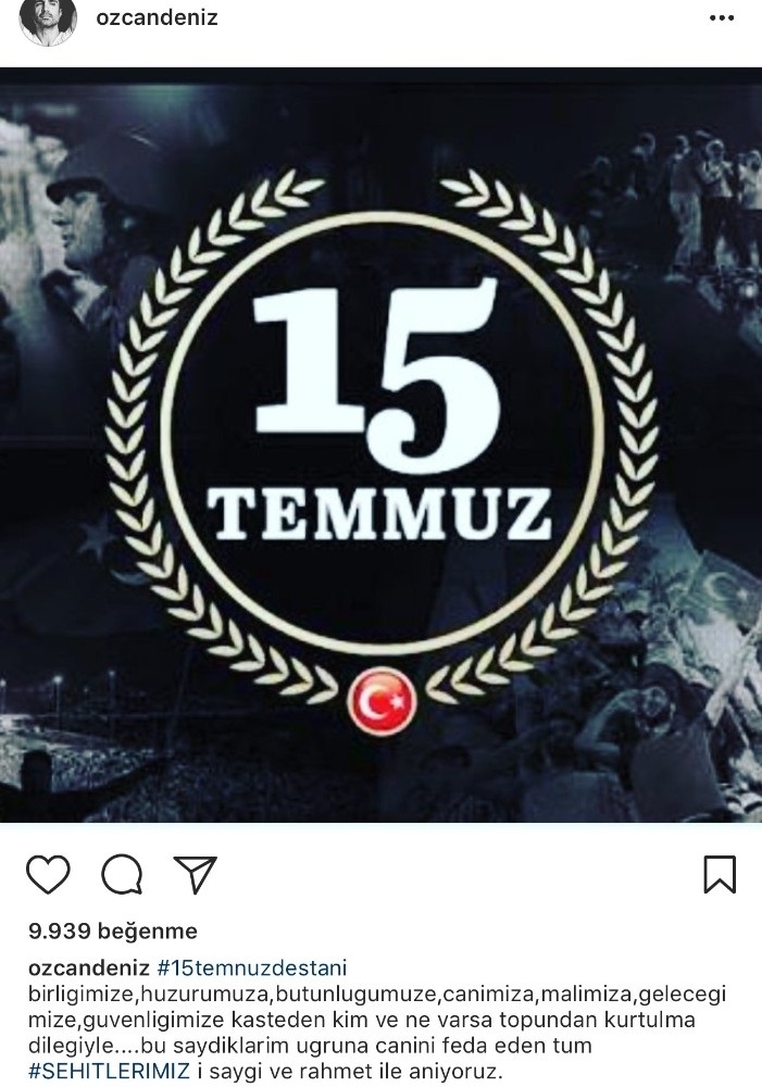 Ünlüler de sosyal medya hesaplarından 15 Temmuz mesajları paylaştılar.Geçtiğimiz yıl 15 Temmuz’da yaşanan darbe girişiminin, birinci yıl dönümünde ünlüler sosyal medya hesaplarından mesajlar yayınlayarak darbeyi bir kez daha kınadılar.