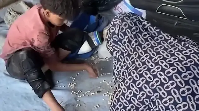 Terör devleti İsrail, Gazze'de bir ailenin evini daha bombaladı. Saldırı sırasında yerlere saçılan gıdaları elleriyle tek tek toplayan Gazzeli aile, sırtlarına aldıkları eşyalarla yaşayacak yeri bir yer aramak için göç yoluna çıktı.