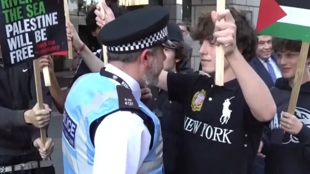İngiltere’nin başkenti Londra'da Filistin destekçileri, terör devleti İsrail'in açlık ve kıtlığı dayattığı Gazze'deki insani krize dikkati çekmek için İsrail’in Büyükelçiliği önünde protesto düzenledi. Protestoya engel olmak isteyen İngiliz polisiyle göstericiler arasında arbede yaşandı.