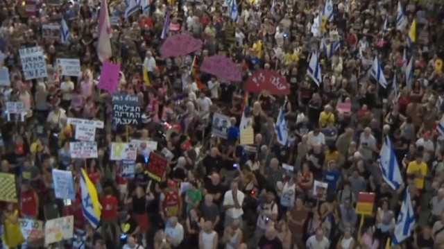 İsrail’in Tel Aviv şehrinde Savunma Bakanlığı binası önünde toplanan yüzlerce gösterici, Gazze'de ateşkesin sağlanması ve esir takası talebiyle Netanyahu hükümetini protesto etti.