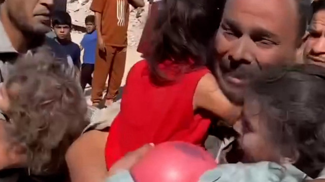 Siyonist İsrail Gazze'nin Han Yunus kentinde, içinde sivillerin olduğu bir binayı bombaladı. İşgalci güçlerin saldırısı sonucu iki küçük kız çocuğu enkaza dönen binadan sağ olarak çıktı. Çocuklarının Katil İsrail saldısında kaybettiğini düşünen Gazzeli baba, kızlarının sağ olduğunu görünce çocuklarına sarılarak sevinç gözyaşları döktü.
