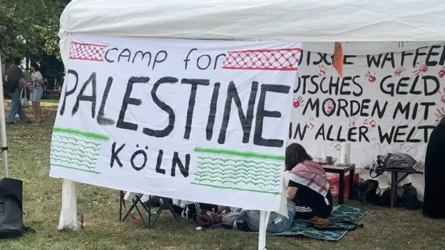 Almanya’nın Köln şehrinde, İsrail’e silah ihraç eden firmalara karşı protesto düzenlendi. Göstericiler, kamp kurarak alana pankartlar yerleştirdi.