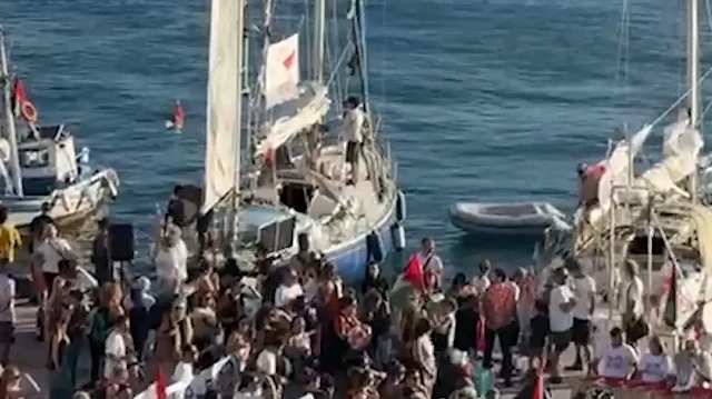 Terör devleti İsrail'in Gazze'ye ablukasını kırmak ve Filistin'le dayanışma için yola çıkan Küresel Sumud Filosu'na Yunanistan'dan katılacak tekneler, Siros Adası'ndaki limanlardan denize açılmaya başladı. Teknelerin hareketinden önce bir araya gelen göstericiler, ellerindeki Filistin bayrakları ile Sumud Filosuna katılacaklara destek verdi.