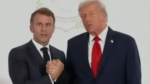 Gazze’deki soykırımın sona erdirilmesi ve kalıcı barışın tesis edilmesi amacıyla Mısır’ın Şarm el-Şeyh kentinde düzenlenen Gazze zirvesine dünyanın dört bir yanından liderler katıldı. Zirvede liderlerle görüşen ABD Başkanı Donald Trump, Fransa Cumhurbaşkanı Emmanuel Macron ile fotoğraf çekileceği sırada Fransız lider ile yaşadığı an kameralara böyle yansıdı.