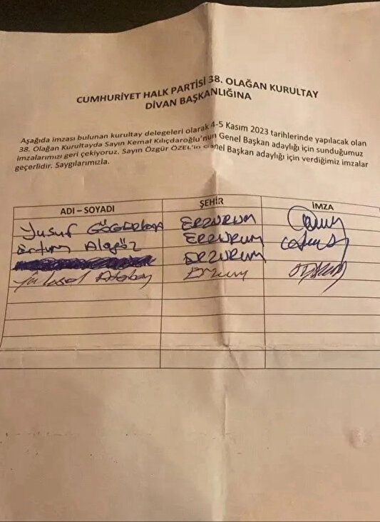 “İl başkanı bizi yemekten sonra Ulus’ta bir pavyona götürdü. İçerisi kalabalıktı. İl başkanı, ‘Özgür Özel’e dört imza daha lazım’ dedi. Kemal Bey’e imza vermek isteyen delegeleri ikna etmeye çalışıyordu. Benim itirazıma rağmen il başkanı, bizim delege Yüksel Atabay adına sahte imza attı. Bu belgeyi gece saat 03.00’te gazeteci Şaban Sevinç’e gönderdi.”