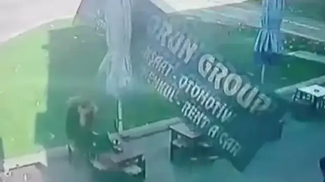 Bursa’da kafede oturan iki kişi, lodosun etkisiyle yerinden koparak düşen tabelanın altında kalmaktan kıl payı kurtuldu. O anlar, iş yerinin güvenlik kamerasına yansıdı.