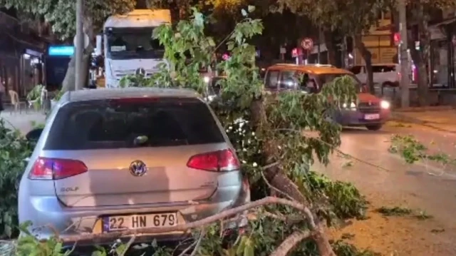 Edirne'de Atatürk Bulvarı'nda kaldırımdaki bir ağaç yola devrildi. Ağacın dalları park halindeki bir otomobil ve seyir halindeki şehir içi yolcu taşımacılığı yapan minibüsün üzerine düştü. Otomobillerde hasar meydana geldi.