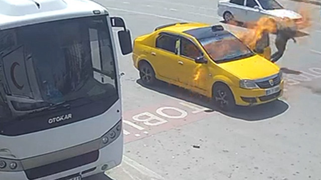 Elazığ’da durakta yolcu bekleyen bir ticari taksi, sürücünün çakmak çakmasıyla bir anda alev aldı. Otomobilin saniyeler içinde alev topuna dönüştüğü anlar güvenlik kameralarına yansıdı. Olay, Gazi Caddesi üzerinde eski Öğretmenevi karşısındaki otobüs duraklarında meydana geldi. Edinilen bilgiye göre, aracında yolcu bekleyen taksi sürücüsü R.A., araç içinde çakmağını çaktığı sırada, henüz belirlenemeyen bir nedenle otomobil bir anda alev aldı. Sürücü, can havliyle kendini dışarı atarken, araç kısa sürede tamamen alevlere teslim oldu. Kolundan ve yüzünden yaralanan sürücü, ihbar üzerine olay yerine gelen sağlık ekipleri tarafından ilk müdahalesi yapıldıktan sonra Fırat Üniversitesi Hastanesi’ne kaldırıldı. Yangın, itfaiye ekiplerinin müdahalesiyle kontrol altına alındı.