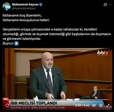 İBB AK Parti Belediye Meclis Üyesi Muhammet Kaynar, İBB Kasım Ayı 5’inci Oturumu’nda devam eden yolsuzluk ve rüşvet soruşturmasına ilişkin hazırlanan iddianameyle ilgili dikkat çeken açıklamalarda bulunmuştu. Sosyal medyadan konuşmasını yeniden paylaşan Kaynar, “Gerçeklerin ortaya çıkmasından o kadar rahatsızlar ki, kendileri okumadığı, görmek ve duymak istemediği gibi başkalarının da duymasını ve görmesini istemiyorlar.” dedi. Muhammet Kaynar İBB oturumundaki konuşmasında iddiaların “ezber cümlelerle geçiştirilemeyeceğini” vurgulayarak teknik delillerin dosyada açık şekilde yer aldığının altını çizdi.