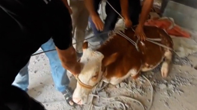 Mardin'in Nusaybin ilçesinde bir evde beslenen kurbanlık buzağı, bodrum kata düşerek mahsur kaldı. İtfaiye ekipleri ve vatandaşların yardımıyla kurtarılan buzağı, sahibine teslim edildi.