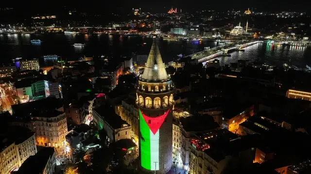 İstanbul’un simge yapılarından Galata Kulesi, Filistin’de yaşanan soykırıma dikkat çekmek amacıyla Filistin bayrağı ile aydınlatıldı. Kültür ve Turizm Bakanlığı tarafından gerçekleştirilen uygulama, hem İstanbullular hem de sosyal medyadan takip edenler tarafından büyük ilgi gördü. Dron ile havadan kaydedilen görüntülerde kuleye yansıtılan kırmızı, yeşil, siyah ve beyaz renkler, Filistin halkına destek mesajı niteliği taşıdı. Etkinlik, şehir merkezinde farkındalık oluşturmak ve Filistin’deki insanlık dramına dikkat çekmek için planlandı.