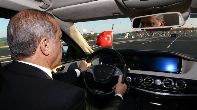 Cumhurbaşkanı Erdoğan, İzmit Körfez Geçişi asma köprüsü son tabliye yerleştirme töreni sonrası aracı kendi kullandı. Başbakan Davutoğlu da kendisine eşlik etti.