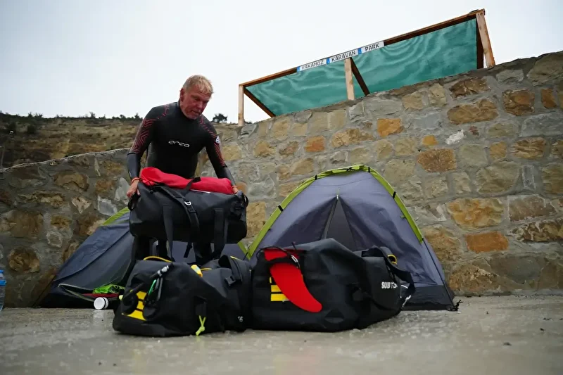 Yüzücü, karaya çıktığında çadır kurarak dinleniyor ve ertesi gün rotasına devam ediyor.