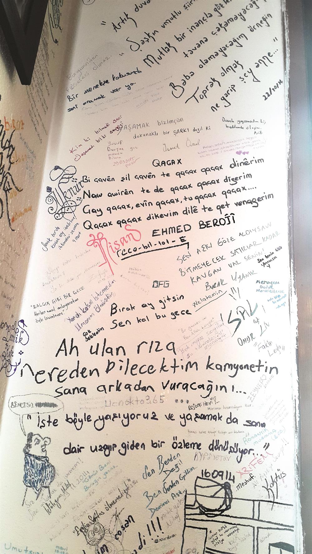 Her gittiğimde 'acaba hangileri yeni' diye dikkatle inceliyorum duvarları. Yolunuz düşerse mutlaka uğrayın ve duvarları okuyun. Hatta herhangi bir boşluk bulabilirseniz, yazın şiirinizi. Şiir, kağıtta da, sokakta da, duvarda da çok güzel çünkü.