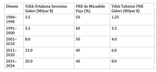 Aşağıdaki tablo, Türkiye’nin 1984–2024 yılları arasında savunma bütçesinden PKK ile mücadeleye tahmini olarak ayırdığı payları göstermektedir. Her dönem için ortalama savunma gideri ve bu giderin PKK ile mücadeleye ayrılan kısmı yüzdesel olarak tahmin edilmiştir. Bu yöntemle yıllık tahmini harcamalar belirlenmiştir.