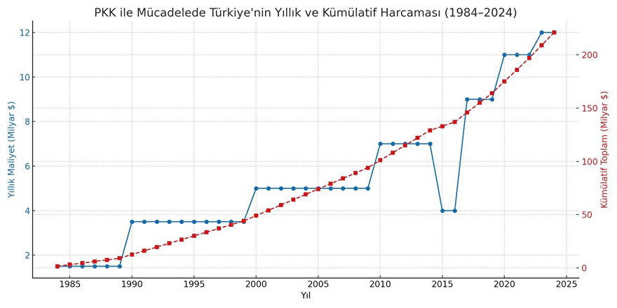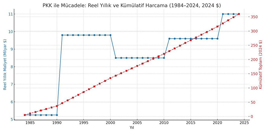 Yukarıdaki grafik, Türkiye’nin 1984’ten 2024’e kadar PKK ile mücadele kapsamında yıllık (sol) ve kümülatif (sağ) tahmini harcamalarını göstermektedir.