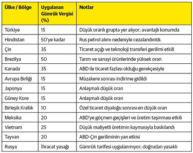 ABD ilk açıklanan haliyle %10 olan gümrük vergisini Türkiye için yüzde 15 olarak revize etti. Bu netice ilk açıklanan haline göre dezavantaj içermekte olsa da diğer ülkelerin durumu ile kıyaslayınca avantajımızın devam ettiği görülmektedir. Son durumu ana hatlarıyla derleyecek olursak aşağıdaki tablo meydana çıkmaktadır.