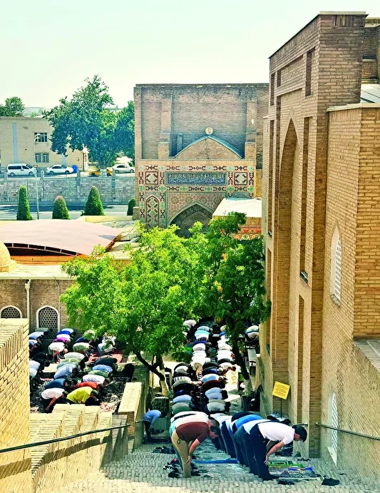 Özbekistan’da cuma namazları normalde çok hızlı biter: Vaz u nasihat kısmı ezandan önce tamamlandığından, hutbede sadece hamdele-salveleyle bir ayet ve bir hadis okunur, sonrasında namaza geçilir. Hutbe ve namazın toplamı en fazla beş-altı dakika civarındadır. Ancak bu defa biraz farklı oldu. Ezandan önce hayatımda şimdiye kadar dinlediğim en güzel, en içli, en dokunaklı Mevlid-i Nebî tilaveti -hem de Arapça olarak- icra edildi. “Merhaba” faslında hep beraber ayağa kalkıp Hz. Peygamber’i selamlamak, görülmeye değer bir manzaraydı. Onun mübarek na’şına son kez dokunan Kusem bin Abbas’ın dizi dibinde bunu yapmak, kalplerimizi ayrıca coşturdu.